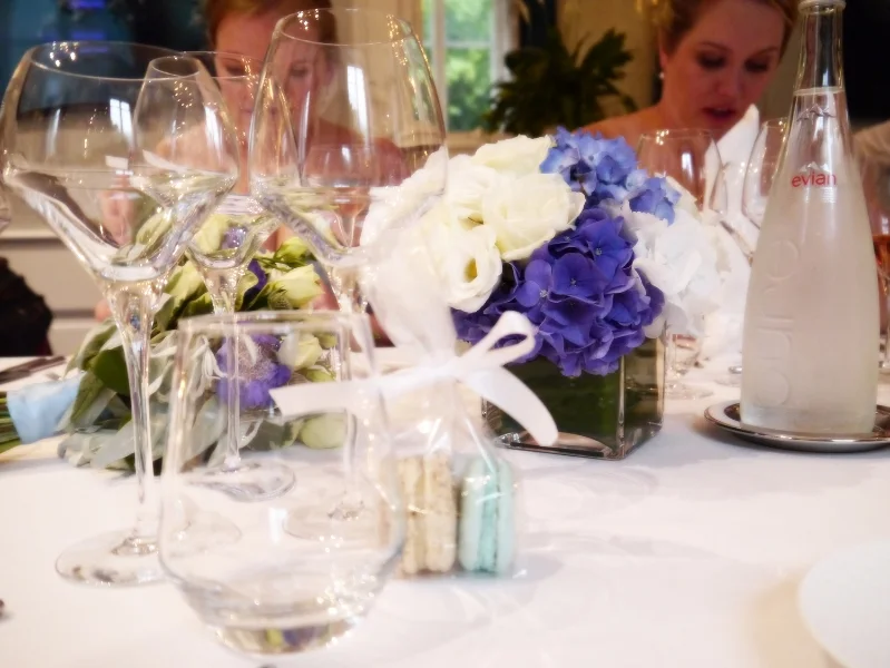In the dining room, I was so taken by how beautiful the dinner table looked. All the glass, flowers, and the custom color macarons just exuded elegance. Being that we were in France, it felt like we were invited to one of the royal parties hosted by Marie Antoinette and Louis XVI.